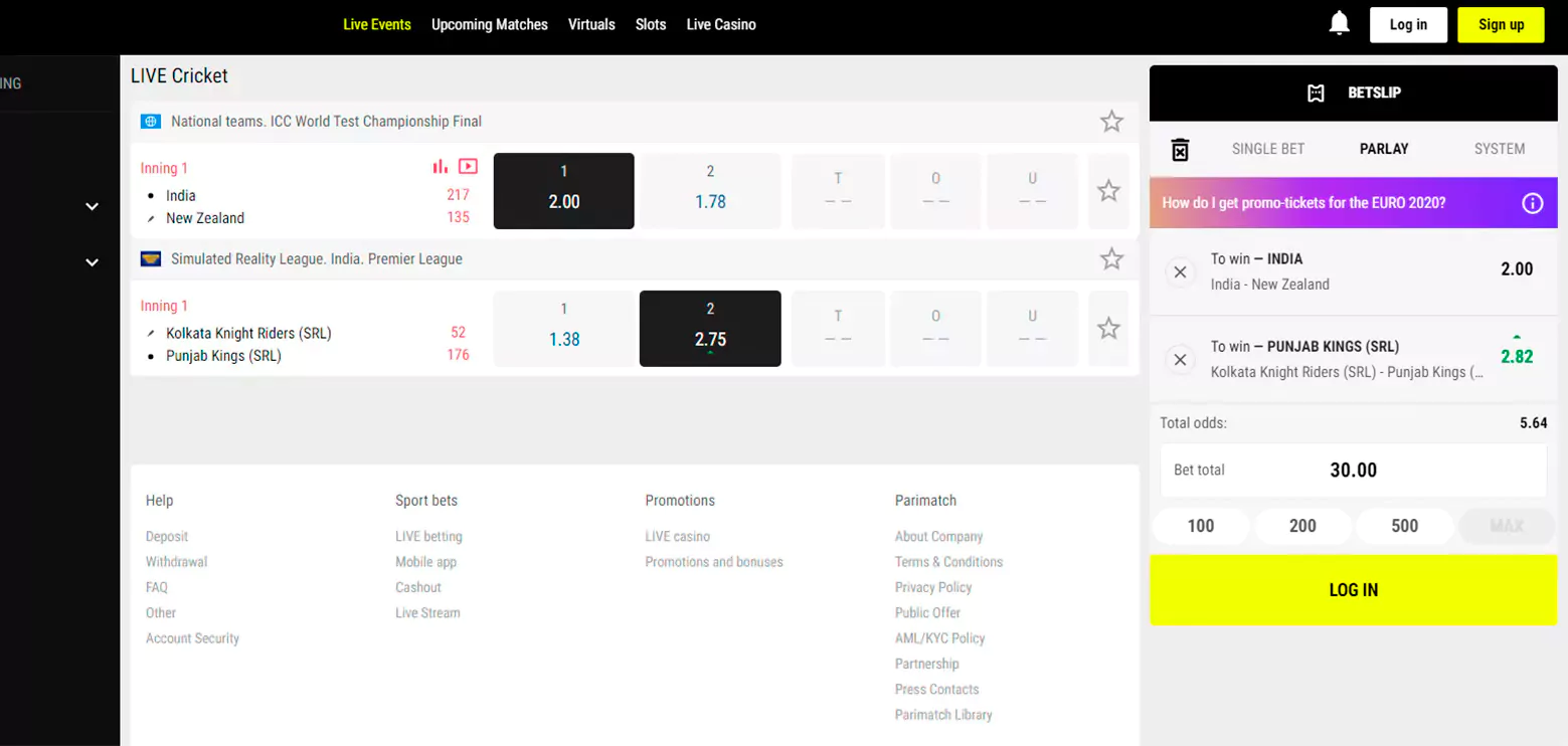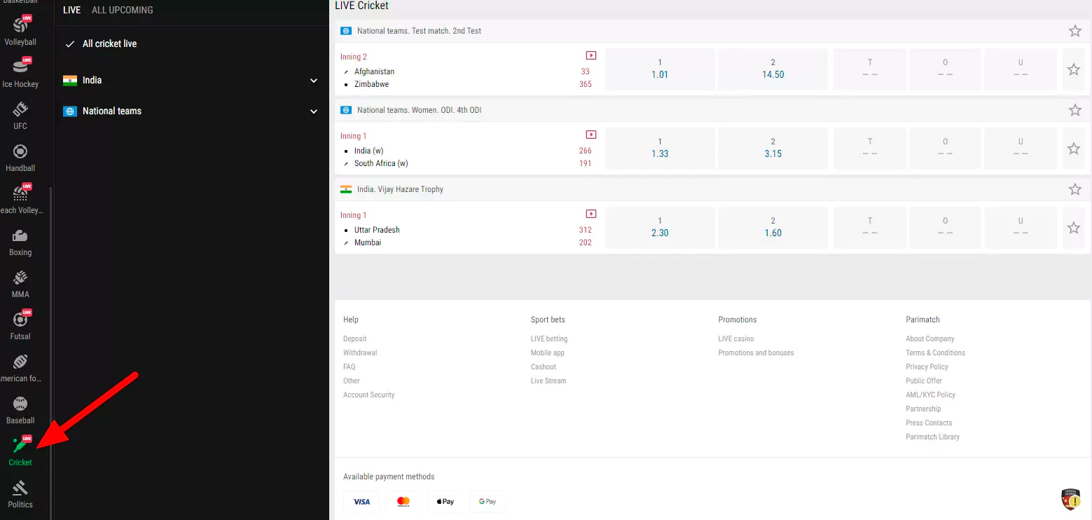 প্রাথমিকভাবে, আপনি কেবলমাত্র সাধারণ বেটগুলো দেখতে পাবেন। প্রেডিকশনের প্রসারিত তালিকা দেখতে, ম্যাচের একটিতে ক্লিক করুন। ম্যাচ শুরু হওয়ার পরে আপনি লাইভ মোডে প্যারিম্যাচে ক্রিকেটে বেটিং করতে পারেন। এটি করতে, বাম দিকের মেন্যুতে “লাইভ গেমস” এ যান।