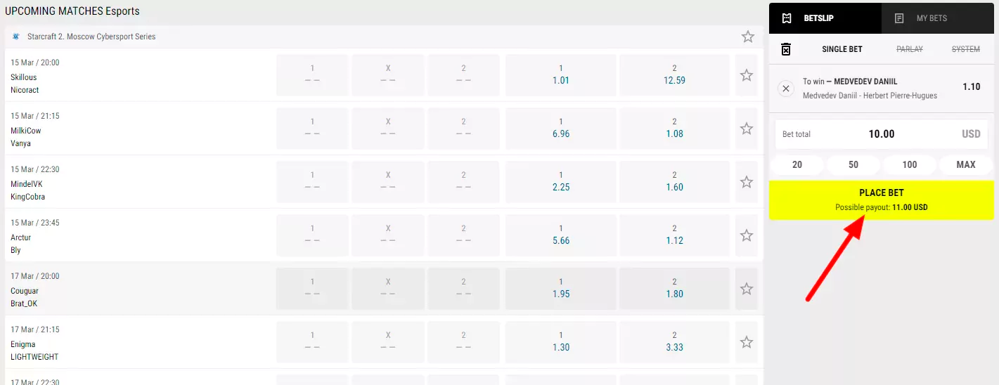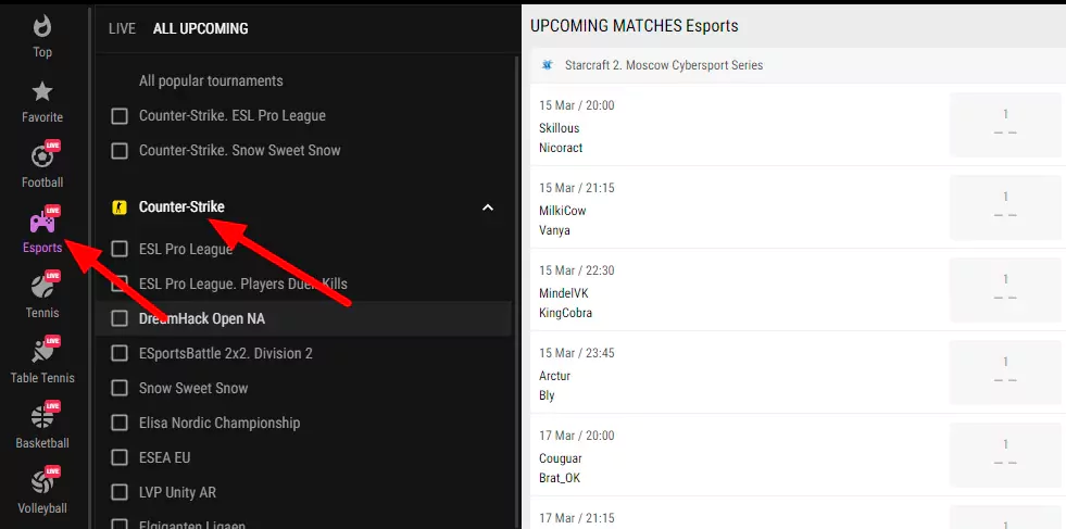 বেশিরভাগ ম্যাচই “সাইবারপোর্টস” বিভাগে দেখানো হয়। আপনি এগুলি এখানে “লাইভ” বিভাগেও খুঁজে পেতে পারেন। এই বিভাগে, আপনি ইতিমধ্যে শুরু হয়ে যাওয়া ইভেন্টগুলিতে ভবিষ্যদ্বাণী বা প্রেডিকশন করতে পারবেন।