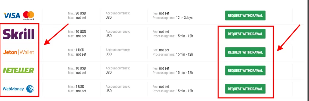- केवल वे पेमेंट सिस्टम ही विड्रॉल के लिए उपलब्ध हैं, जिनका उपयोग आपने पहले डिपॉजिट करने के लिए किया था। डिपॉजिट करने के बाद, सेवा को विड्रॉल पेज में जोड़ा जाएगा;