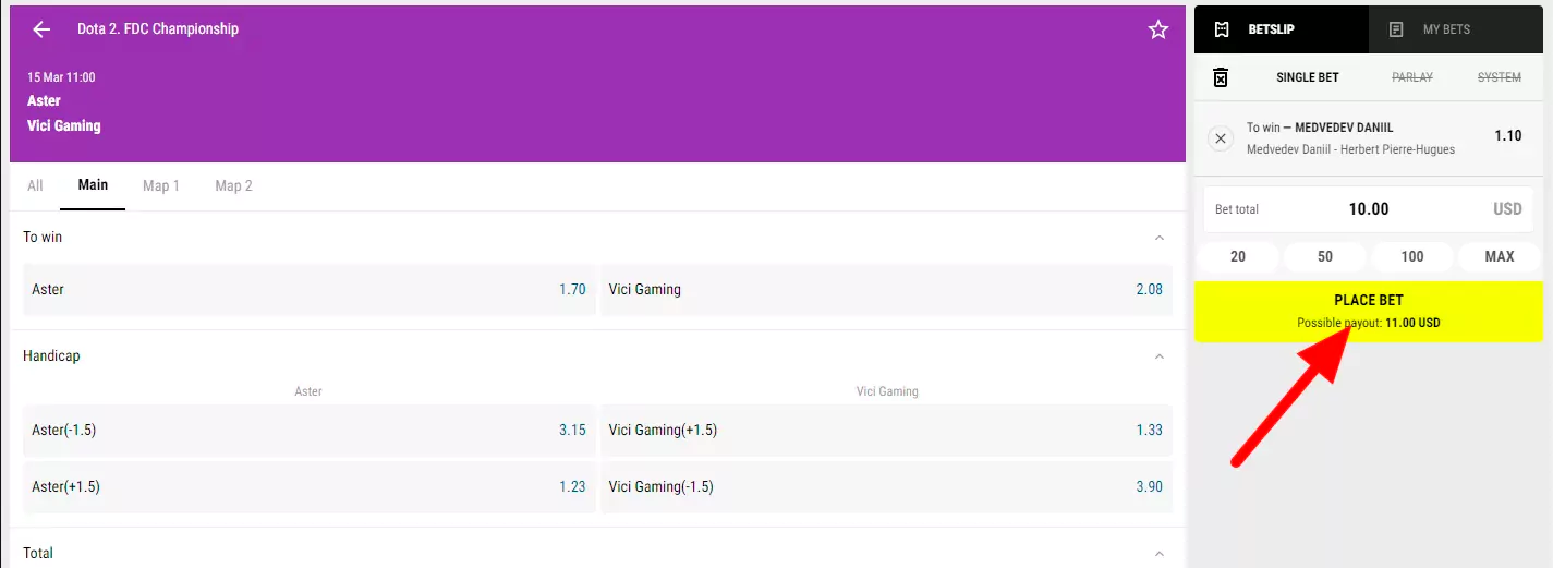 Dota 2 پر شرط لگانے کے لیے آپ کو سب سے پریمیچ اکاؤنٹ درکار ہوگا جسے حاصل کرنے کے لیے آپ کو ہماری ویب سائٹ پر رجسٹریشن کروانا ہوگی۔ اکاؤنٹ حاصل کرنے کے بعد آپ کو کو ہمارے سافٹ ویئر کلاینٹ میں میں اپنے یوزرنیم اور پاسورڈ کے ساتھ لاگان کرنا ہوگا۔ اس سے کوئی فرق نہیں پڑتا کہ آپ رجیسٹریشن اور لاگ ان کے لیے اپنا کمپیوٹر استعمال کرتے ہیں یا موبائل، ایپ ڈاؤن لوڈ کرتے ہیں یا موبائل براؤزر استعمال کرتے ہیں۔ ایک پریمیچ اکاؤنٹ ڈپازٹ کرنے اور میچوں پر شرائط لگانے کے امکانات کو کھول دے گا۔ ایک بار جب آپ اپنے اکاؤنٹ میں لاگ ان ہو جاتے ہیں، تو آپ کو شرط لگانے کے لئے مندرجہ ذیل مراحل سے گزرنا پڑے گا: